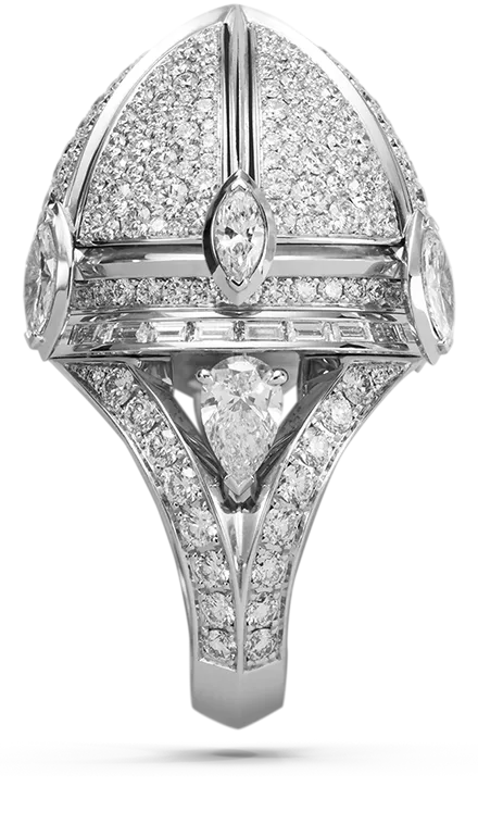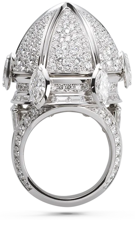 The 18k white gold ring boasts a large dome-shaped design, encapsulated by full diamonds, and held together by spider claws – a signature of the Charles Zuber brand. Life is a performance, and this stunning ring is the ultimate statement piece that will leave everyone in awe of your artistry and avant-garde style. Treat yourself to the epitome of luxury with the Pomander collection.
