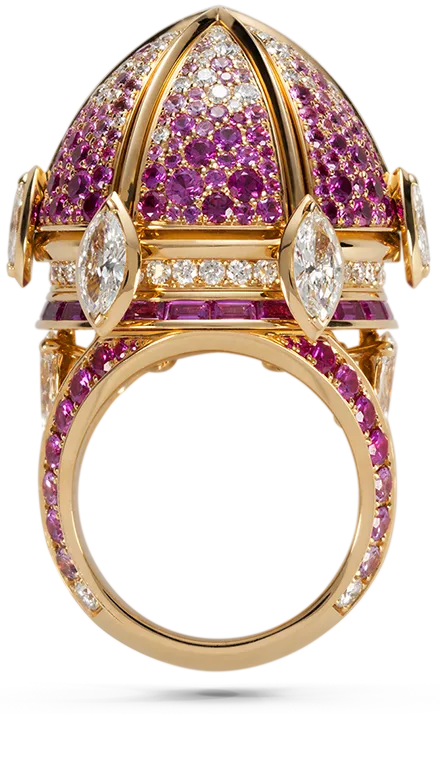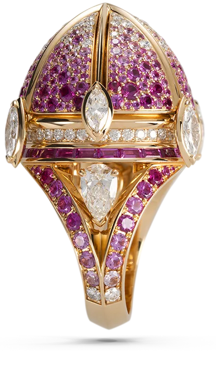 Discover the captivating allure of the “Pink Sapphire” Pomander ring, a true masterpiece from the Charles Zuber collection. Crafted from the finest 18k rose gold, this luxurious piece is encircled by a delicate protective net with threads so fine that they gracefully fade away, allowing the precious and semi-precious stones to shine in all their glory.